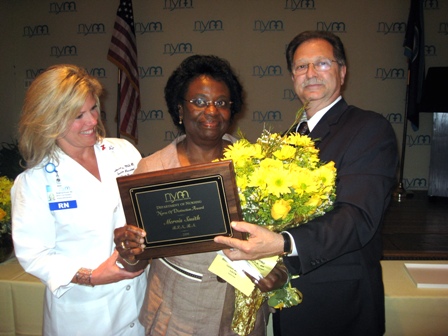 Rebecca Flood, R.N., senior vice president for nursing, Mervis Smith, R.N., NYM''s 2009 Nurse of Distinction and Robert Seminara, M.D., president of the Hospitals Medical Board.