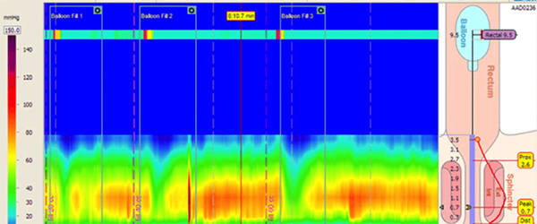 High-resolution 3D anorectal manometry in a 5-year-old boy with chronic refractory constipation. There is normal relaxation of the internal anal sphincter with each balloon inflation, ruling out Hirschsprung’s disease as a possible etiology for chronic constipation. (Courtesy of Dr. Julie Khlevner)