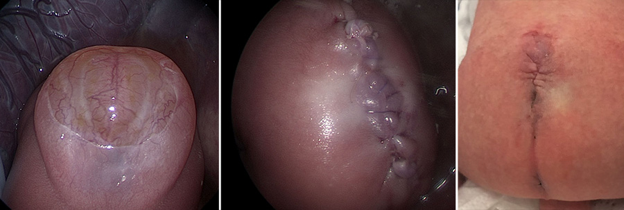 “The advantage of the externalization of the uterus is that sutures can be placed in a box configuration around where the ports are going to be placed,” says Dr. Duron. “This tacks up the membranes to the uterus to help prevent premature rupture. Another advantage of this approach is the possibility of vaginal delivery after fetoscopic repair.”