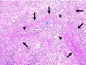 Pre-operative liver biopsy shows expansion of portal tracts with fibrosis, biliary ductular proliferation, and cholestatic plugs. (Courtesy of Dr. Steven Stylianos)