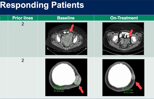 Representative images from a subset of patients, with two prior lines of treatment, achieving partial response on the study. Top: A patient who experienced reduction in size of a large pelvic mass; Bottom: A patient who had significant shrinkage of a scalp lesion among other sites of metastatic disease (Courtesy of Dr. Matthew Ingham)