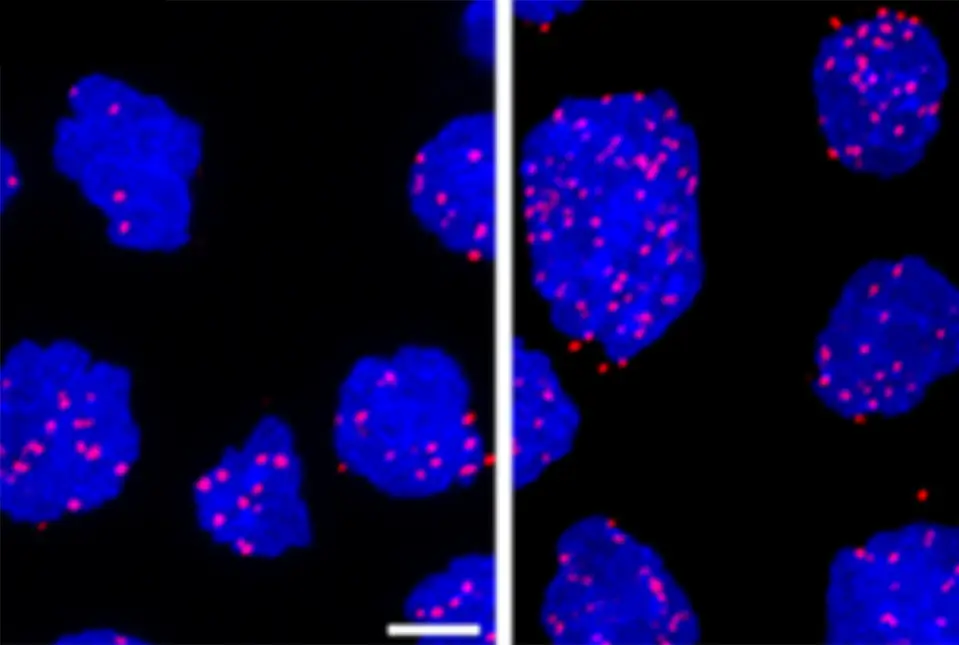 Diffuse large B cell lymphoma cells that are untreated (left panel) and treated with a DNA damaging agent (right panel). The pink dots indicate XPO-1 protein interacting with a protein that binds mRNAs and chaperones them from the nucleus.