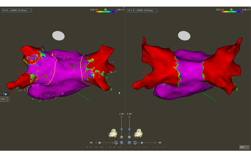 Left atrium electrical activity before and after pulmonary vein ablation (red = electrically quiet).