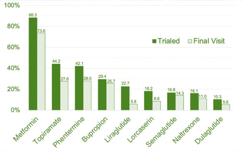 Metformin (88.3%), topiramate (44.2%), phentermine (42.1%), and bupropion (29.4%) were the most common medications trialed in the study. At the final visit, the most commonly used AOMs, alone or in combination, were metformin (73.6%), phentermine (28.0%), topiramate (27.6%), bupropion (25.7%), and semaglutide (14.3%). Metformin, topiramate, and bupropion were associated with increased odds of maintaining 10% or greater weight loss. Whereas a mean of 4.3 AOMs per patient were trialed over the study period, at the final visit patients were taking a mean of 2.1 AOMs, and 65% were taking two or more.