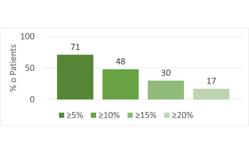 Patients were eligible for the study if they had an initial visit between April 1, 2014, and April 1, 2016, and had follow-up of six months or more. Average weight loss from initial to final visit – the study’s primary endpoint – was 10.4% at a mean follow-up duration of 4.4 years. The proportions of patients who met the weight reduction targets of 5% or greater, 10% or greater, 15% or greater, and 20% or greater were 70.8%, 48.1%, 29.9%, and 17.1%, respectively. Those results were “in the range of what I think we expected,” notes Dr. Shukla. She describes the 10% or greater weight loss at five years as “a good result because we know that is an amount of weight loss that actually has important health benefits. The goal is not just to lose weight; weight’s a number. The question is, what does that weight loss do to you? How does it improve your blood pressure? How does it reduce your risk of diabetes?”