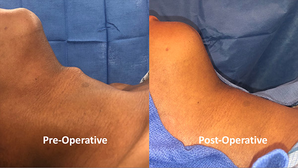 Drs. Banuchi and Helman’s patient was a 21-year-old trans woman with gender dysphoria. She had previous facial feminization surgery including rhinoplasty and sliding genioplasty but remained dissatisfied with the appearance of her neck. She had no complications from the TOEVA procedure and was very pleased with her neck appearance after the surgery.