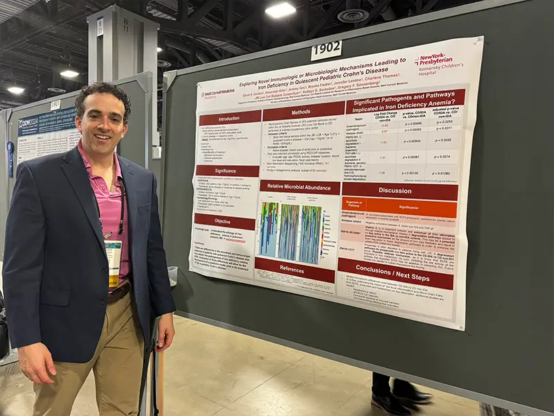 Elliott Gordon, MD, MSc, FAAP, a pediatric gastroenterologist at NewYork-Presbyterian and Weill Cornell Medicine, presented a poster looking at the microbiologic mechanisms at play in quiescent pediatric Crohn’s disease with iron deficiency.
