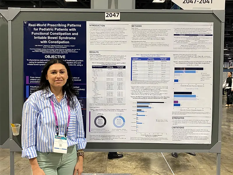 Julie Khlevner, MD, Director of the Pediatric Gastroenterology Motility Center at NewYork-Presbyterian Morgan Stanley Children’s Hospital, presented a poster at DDW examining real-world prescribing patterns for pediatric patients with FC and IBS with constipation (IBS-C). The retrospective, observational study evaluated prescription patterns for both conditions across the U.S. using data de-identified from medical and pharmacy closed claims between January 2018 and June 2023. During that timeframe, approximately one-third of pediatric patients received prescription medication for constipation; polyethylene glycol 3350 (PEG) was the most frequently prescribed, followed by lactulose. Neither medication is currently FDA-approved for use in pediatric FC and IBS-C.