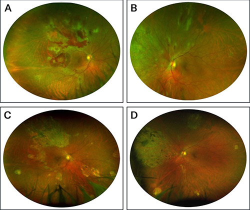 In the images above: (A, B) Funduscopic examination revealed full-thickness retinal necrosis with hemorrhages consistent with CMV retinitis in both eyes. The patient underwent 2 rounds of CMV-specific CTL therapy, during which he received no other systemic or intravitreal antiviral therapies.