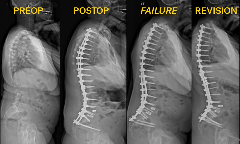 A 57-year-old female with adult idiopathic scoliosis who underwent posterior spinal instrumented fusion from T2 to Pelvis with interbody fusions at L4-5 and L5-S1. Postoperatively, she had pseudarthrosis with bilateral iliac screw fractures. Revision surgery included re-instrumentation from T11 to the pelvis with 4 pelvic fixation points, 5 rods spanning the lumbo-pelvis with accessory rods anchored distal to S1.