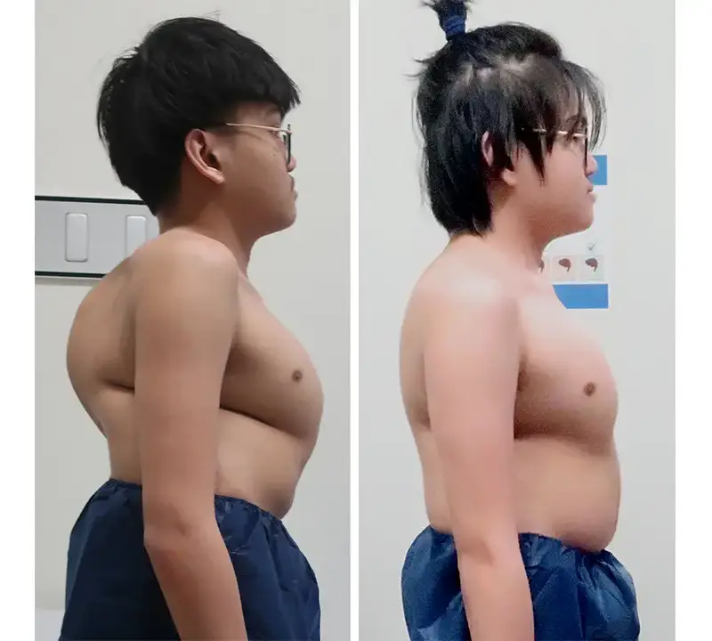 Chinno before and after the staged treatment to gradually correct the curvature and fuse his spine into its proper position.