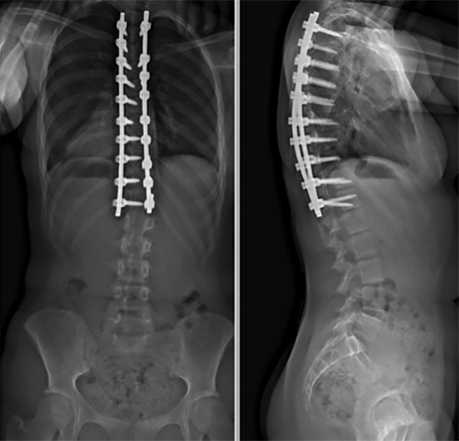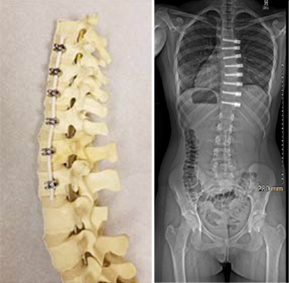 In 2019, the Food and Drug Administration approved anterior vertebral body tethering for patients with adolescent and idiopathic scoliosis who have growth remaining as an alternative to the standard treatment – posterior spinal fusion and instrumentation. In the tethering procedure, vertebral body screws and a flexible tether are placed laterally from a thoracoscopic or thoracotomy approach into the vertebral body on the convex side of a spinal deformity. A tensioning cord is secured to the vertebral body screws with set screws to connect the levels of the construct. The device provides a lateral tension band across the convex side of the spine that, on insertion and tensioning, partially corrects the curvature, and subsequently can arrest or correct the deformity through modulation of remaining spinal growth.