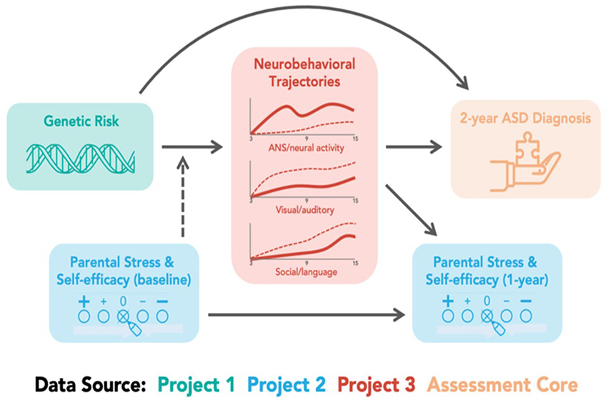 Figure 9. Data analyses span Projects and Cores to advances our understanding of genetic risk, parental impact, and neurobehavioral trajectories that predict autism.