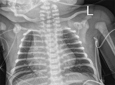 A full-term newborn with respiratory distress and right upper lobe atelectasis should raise suspicion for primary ciliary dyskinesia. This may be associated with congenital heart disease (as in this case with cardiomegaly, also noted on the chest X-ray). (Source: Image courtesy of Aliva De, MD.)