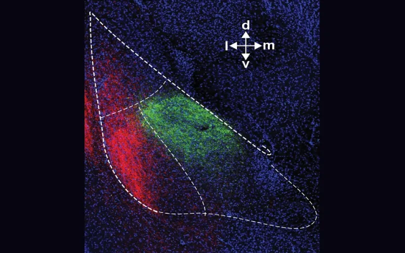 Fluorescent image of the BLA (outlined) showing projections from the insular cortex (red) and the prefrontal cortex (green). Credit: Dr. Ipsit Srivastava