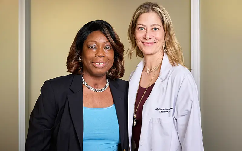 Nadine Davis, left, with Dr. Haythe. Nadine receives follow-up care every six to eight weeks with the lung, liver, and heart teams.