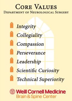 To help meld the concepts of expertise and humanity, Dr. Stieg established seven pillars that would infuse and ultimately define the department’s operation both clinically and culturally: integrity, collegiality, compassion, perseverance, leadership, scientific curiosity, and technical superiority.