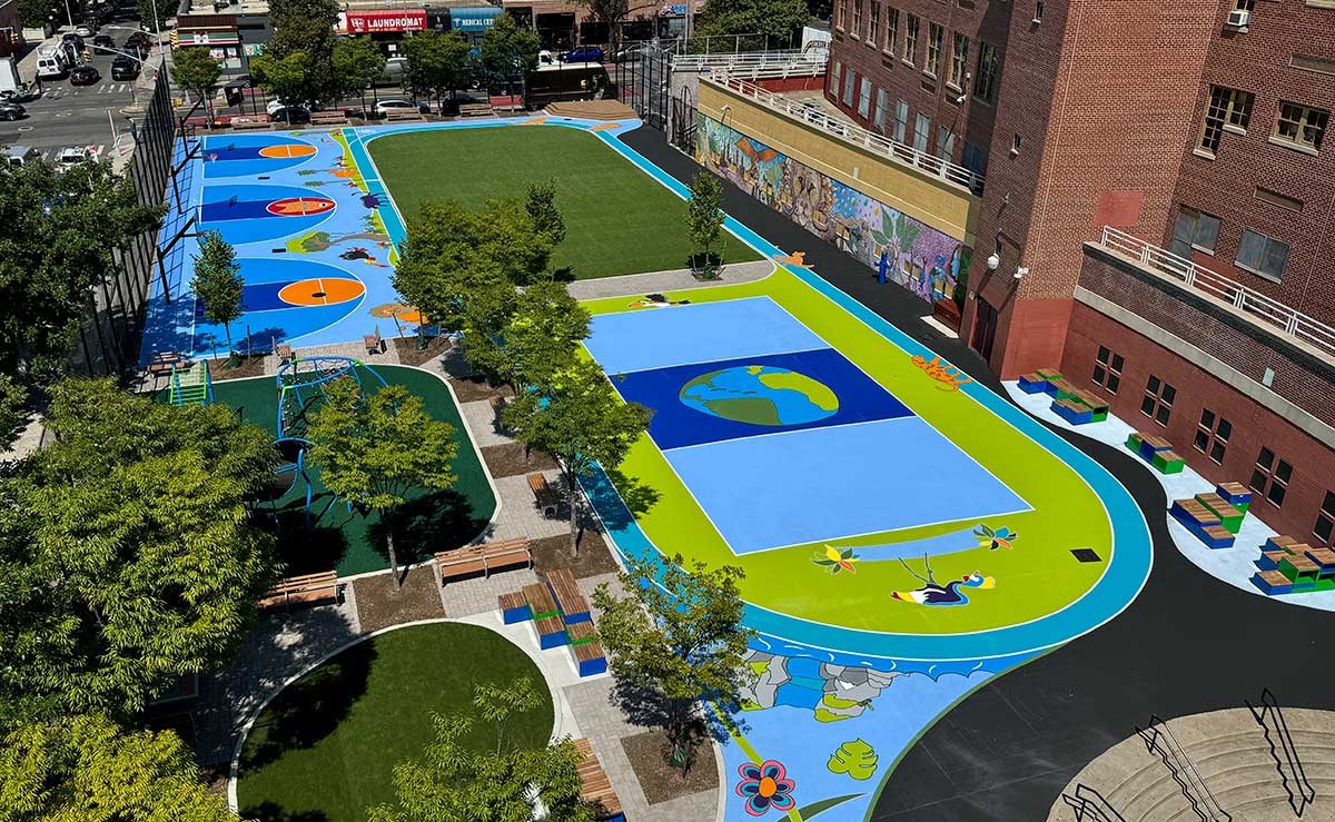 In 2023, NewYork-Presbyterian supported the Trust for Public Land’s New York City Community Schoolyards Program. Since its inception, this program has transformed 232 asphalt schoolyards into bustling, green spaces with gardens, play structures, athletic facilities, outdoor classrooms, and more. The Dalio Center supported two community schoolyard projects that Trust for Public Land designed with the community, located in Jackson Heights and Bedford-Stuyvesant.