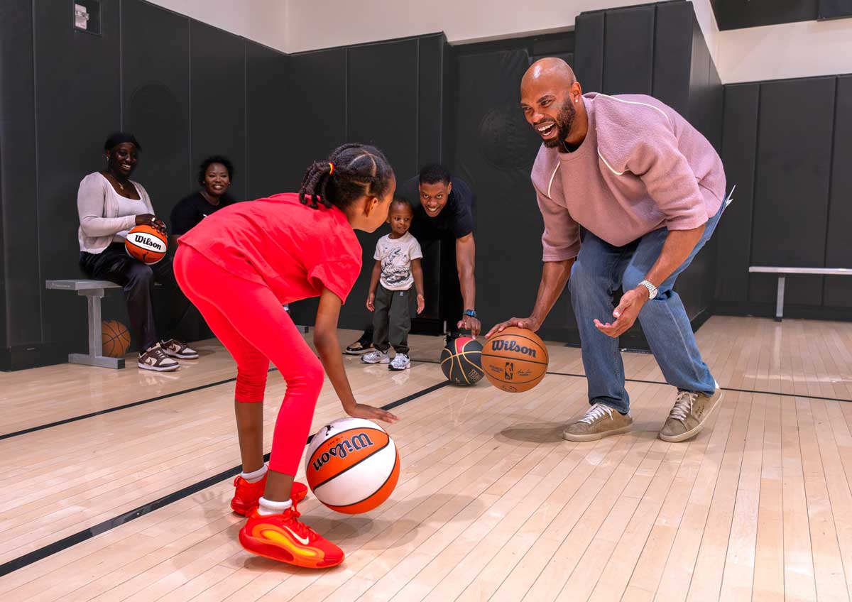 Taj Gibson, NBA player, dribbling with a patient during the Sickle Cell Patient Experience Day at the NBPA