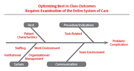 "Medical error is rarely the result of a single, sharp-edge problem and much more often a result of a combination of host, systems, culture, and technique issues,” says Dr. Vitale. “Our M&M conferences are now presented in that structured light. In other words, we use a fishbone process where every suboptimal result or situation that occurs in the department is looked at with a lens of what we could have done differently from the point of view of systems, optimization of host, culture, and technique. When you do this you truly realize how complex the healthcare system is, but it also reveals the many opportunities for improving care that go far beyond the intervention and extend to the entire episode of care.”