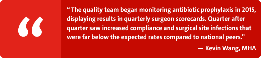 The quality team began monitoring antibiotic prophylaxis in 2015, displaying results in quarterly surgeon scorecards. Quarter after quarter saw increased compliance and surgical site infections that were far below the expected rates compared to national peers. - Kevin Wang, MHA
