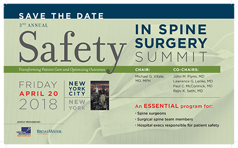 On April 20, 2018, the 3rd Annual Safety in Spine Surgery Summit will be held in New York City.