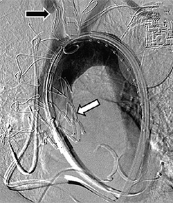 Fluoroscopic imaging of proximal (white arrow) aortic endograft following deployment with visible cerebral protection system (black arrow)