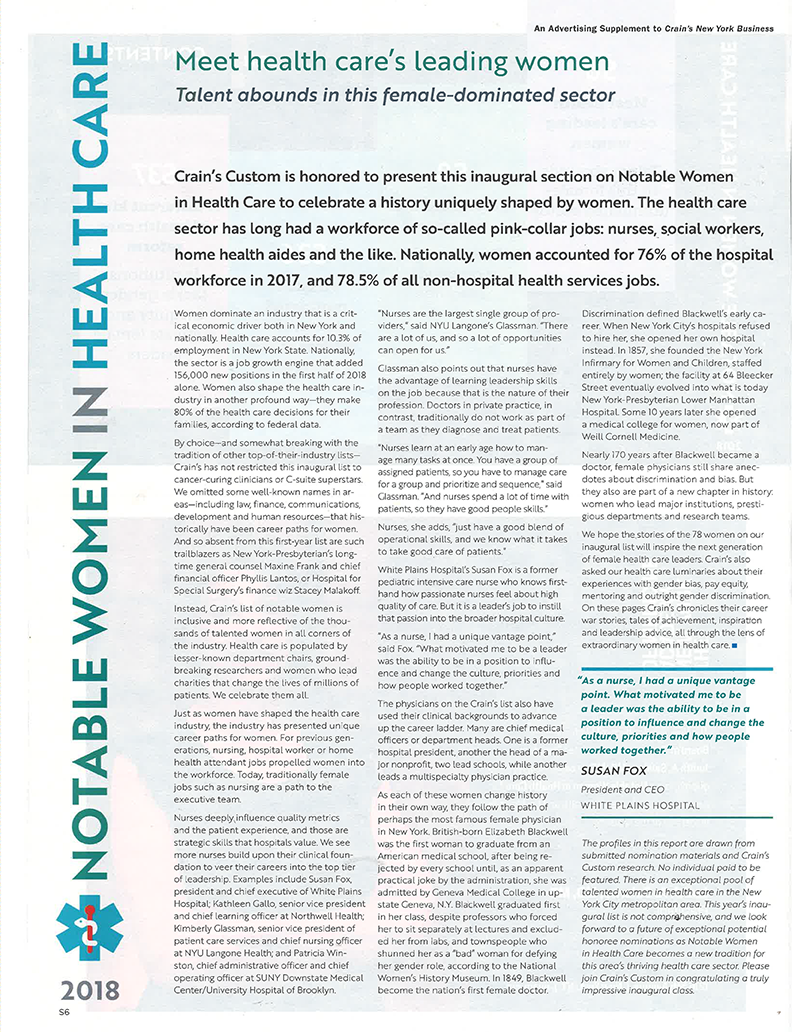 NewYork-Presbyterian Newsroom For Journalists News Archive In the News Media Requests: [email protected] 2018 Notable Women in Health Care by Crain’s New York Business Oct 12, 2018 Stacey Petrower, President, NewYork-Presbyterian Hudson Valley Hospital, is among the 78 women named to the inaugural list of Notable Women in Health Care by Crain’s New York Business.