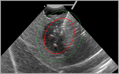 The Sonata System includes a proprietary graphical user interface (SMART Guide), enabling the surgeon to target fibroids and optimize treatment. The SMART Guide displays a real-time graphic overlay on the live ultrasound image, providing safe targeting and delivery of radiofrequency energy. The graphic overlay is controlled by the surgeon to determine the size and location of the ablation zone, safety borders, and the duration of radiofrequency energy delivery.