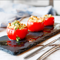 - Fill tomatoes with quinoa filling. Place on a baking sheet and bake about 25 minutes.