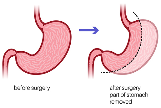 - Laparoscopic sleeve gastrectomy, a procedure for surgical weight loss whereby approximately 80% of the stomach is removed, dramatically reducing the patient's capacity for food intake. This procedure is performed laparoscopically through five small incisions. This surgery has some effect on the body’s absorption of nutrients, and appropriate intake of protein and vitamins after surgery is important.