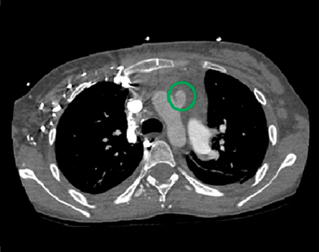 Postoperative mediastinal window showing the location of the modified Potts shunt (green circle).
