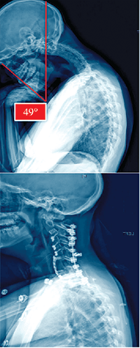 A 28-year-old female with a seven-year history of kyphoscoliosis and dystonia also presented with psoriatic arthritis, ankylosing spondylitis, and cervical dystonia. A three-hour anterior surgery was first performed followed by asymmetric osteotomies to correct the scoliosis at C3-4-5-6-7-T1, with anterior fusion from C2-T1. Posterior osteotomies were then performed in a more than five-hour surgery at all the same levels with a fusion from C2-T2.