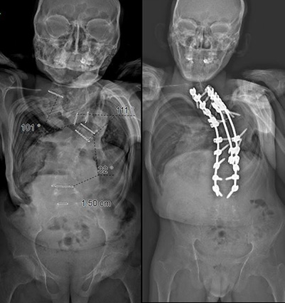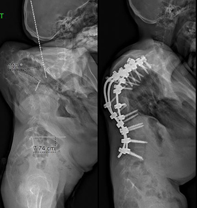A 23-year-old male who had neurofibromatosis and severe thoracic kyphoscoliosis complained of back pain and some shortness of breath along with preoperative right leg pain in his posterior thigh and calf. He presented with some lower extremity weakness and a spastic gait. The patient was in halo gravity for two months for a severe deformity greater than 180 degrees of kyphoscoliosis. Following the halo traction, the patient was treated with a posterior spinal instrumentation and fusion from T1-L4 and is now doing well.