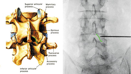Target site – inferomedial edge of the lamina – is identified with fluoroscopy imaging.