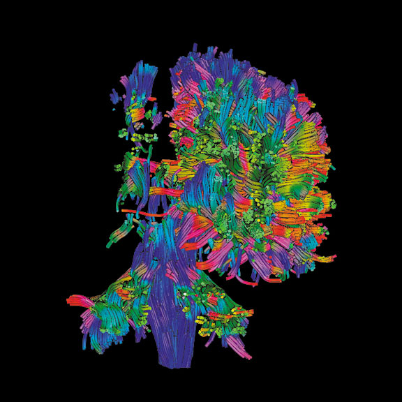 3-D diffusion tensor imaging scan of a rear view of the brain of a 23-year-old with cerebral palsy showing bundles of white matter nerve fibers, which transmit nerve signals between brain regions and between the brain and the spinal cord.