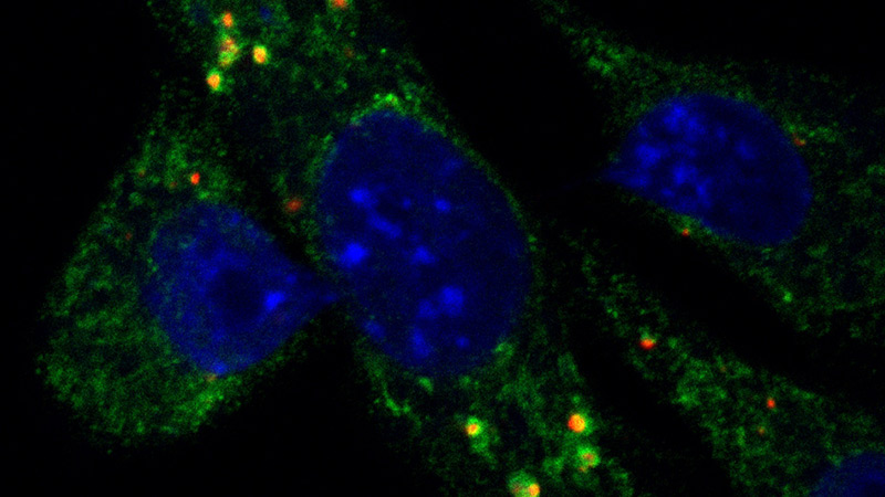 Irradiated breast cancer cells release DNA (red) from mitochondria (green), setting off an alarm for the immune system. The blue color marks nuclei.