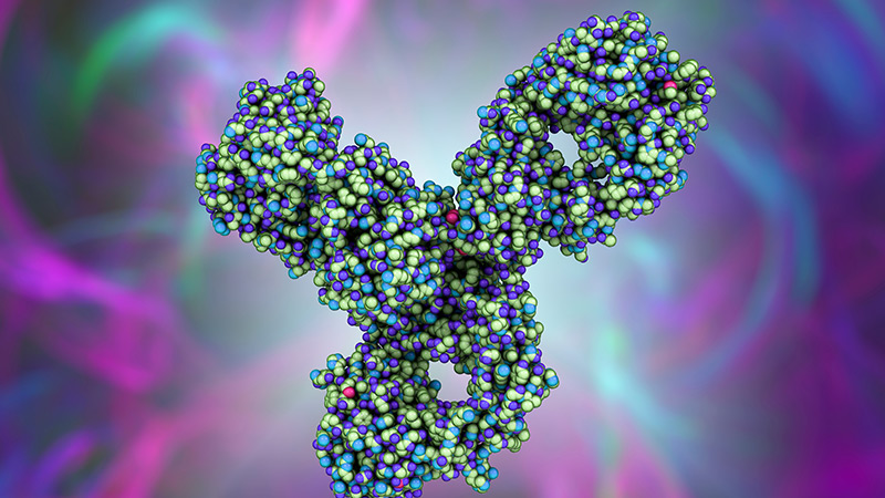 3D illustration of a molecular model of pembrolizumab, which targets the PD-L1 receptor of lymphocytes and is used in cancer immunotherapy.
