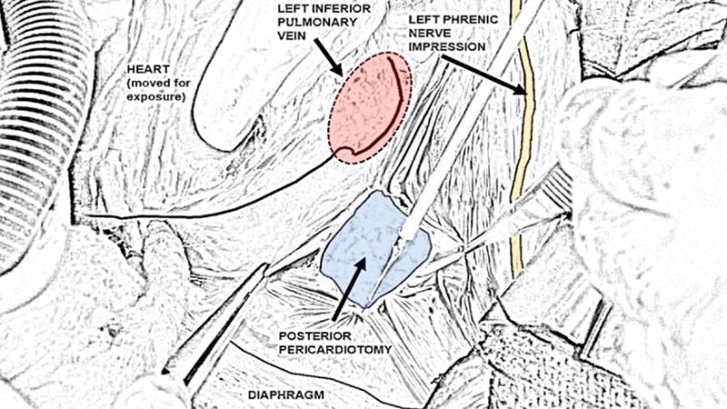 The posterior pericardiotomy is a 4- to 5-cm long incision in the pericardium located posterior and parallel to the phrenic nerve between the left inferior pulmonary vein and the diaphragm. The opening allows drainage of pericardial fluid, blood, and clots into the left pleural space. (Courtesy of The Multimedia Manual for Cardio-Thoracic Surgery)
