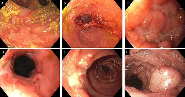 Figure 3: Inflammatory disorders of the pouch. A. C. difficile pouchitis with pseudomembrane; B. Ischemic pouchitis; C. Prepouch ileitis; D. Cuffitis; E. Crohn’s disease involving prepouch afferent limb; F. Inflammatory pseudopolyps.