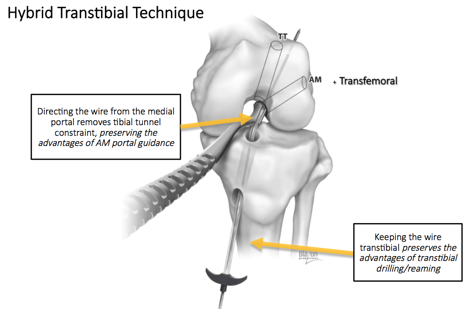 The researchers found that by maintaining a transtibial trajectory for femoral tunnel reaming, the hybrid approach preserved the beneficial features of a traditional transtibial technique, including the avoidance of knee hyperflexion, elimination of the risk of iatrogenic injury to the medial femoral condyle, and favorable femoral tunnel characteristics. Further, guidance of the transtibial guidewire through the anteromedial portal removed any tibial tunnel constraint allowing for anatomic aperture positioning of the femoral tunnel.