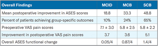 To the authors’ knowledge, this was the first study to provide an analysis of anchor-based clinical differences in patients undergoing anatomic total shoulder arthroplasty.