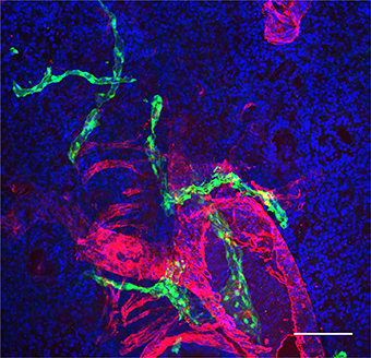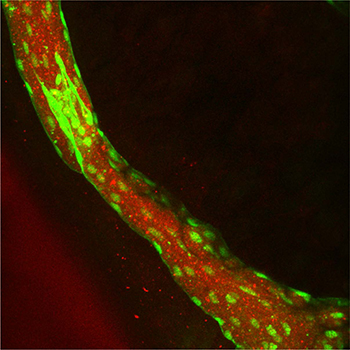 Mouse lung lymphatics (green), in close proximity to an airways and pulmonary artery (red) (Courtesy of Dr. Hasina Outtz Reed)